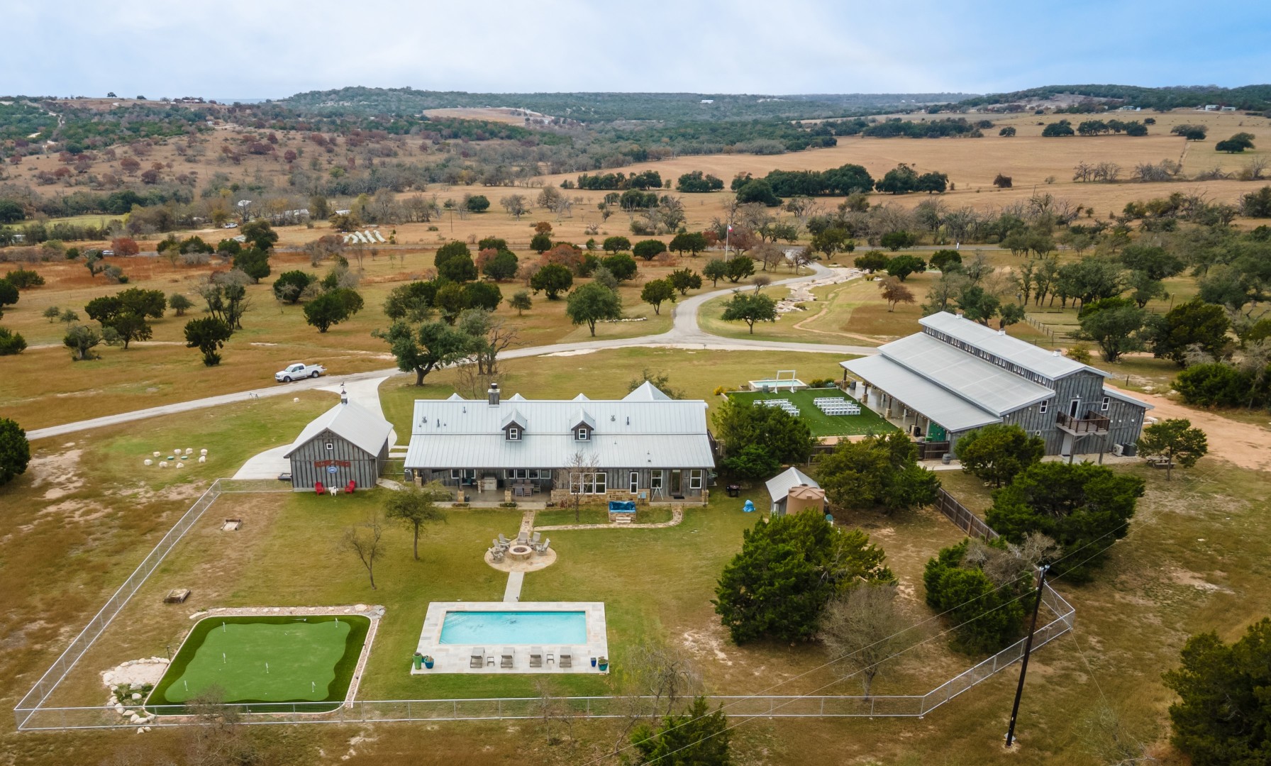 Le Camp Hideaway de Fredericksburg est situé à cinq minutes de la Hill Country Wine Trail et de Luckenbach Texas, et à dix minutes du centre-ville de Fredericksburg. Le centre événementiel, inspiré d'une ferme moderne, dispose d'une salle principale avec de hauts plafonds et un décor blanc et clair. Le magnifique jardin de succulentes situé au nord du hall principal offre un espace pour les photos. Les parois vitrées coulissantes du centre s'ouvrent sur une terrasse couverte et un salon extérieur. Le site dispose également d'une pelouse avec une fontaine et une vue sur le Hill Country, qui peut accueillir des cérémonies ou des réceptions. Les dîners de répétition sont organisés en fonction des disponibilités.