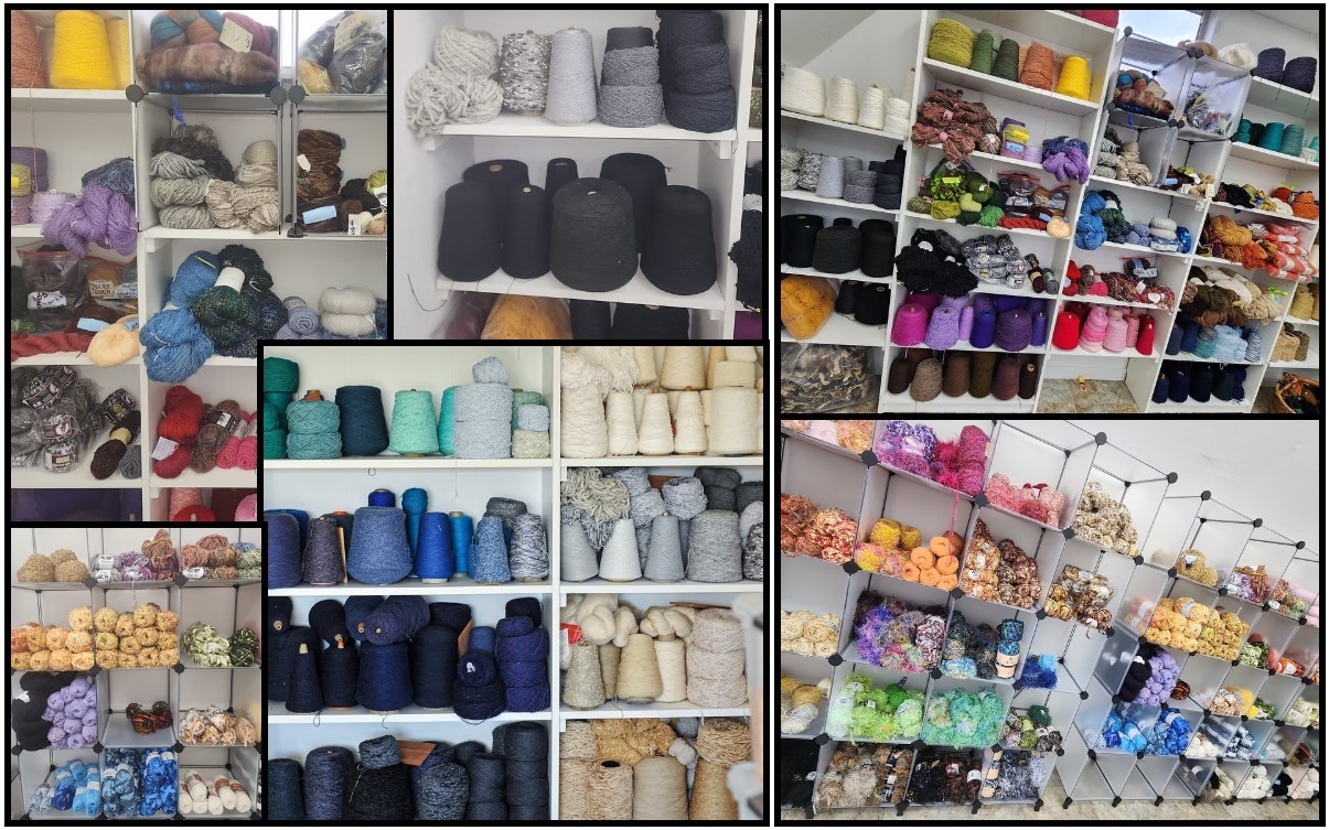 Lots of weaving yarn on cones (for $5/pound), in balls/skeins, and amazing textured yarns in all the colors of the rainbow.