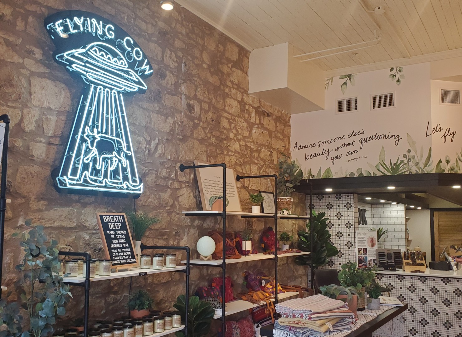 Flying Cow Tallow, situé sur Main Street à Fredericksburg, est le deuxième site de cette petite entreprise familiale créée à Midland, au Texas. Flying Cow est passionnée par la fourniture des meilleurs produits de soin de la peau avec des ingrédients de la plus haute qualité. Elle propose des baumes fouettés fabriqués à la main qui soulagent divers problèmes de peau sans produits chimiques ni additifs fabriqués par l'homme. Flying Cow utilise les ingrédients les plus frais provenant de petites exploitations agricoles biologiques. L'entreprise est très fière du fait que chaque produit a été fabriqué, rempli et étiqueté à la main.