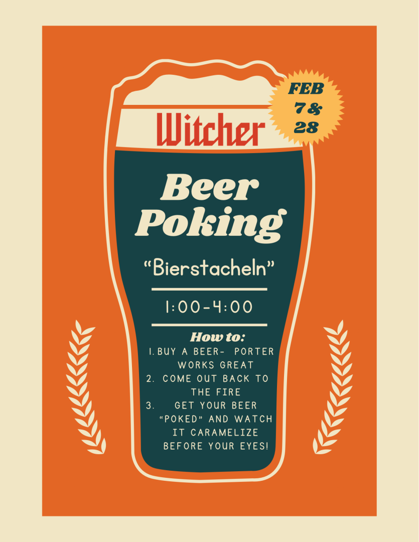 Join us for Beer poking with the brewer, also known as Bierstacheln in German- a winter tradition that involves heating a metal rod in a fire and then plunging it into a glass of beer. This causes sugars in the beer to caramelize and the foam to become extra frothy. Buy a beer at the bar (the porter works great), then bring it out back to be "poked" at the fire! Free entry.