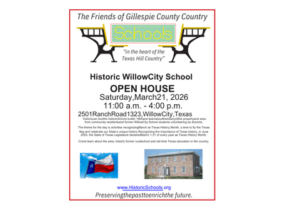 Visitors can tour the historic School built in 1905 and learn about the history of the property and area from community residents and former Willow City School students volunteering as docents.The theme for the day is activities recognizing March as Texas History Month, a time to fly the Texas flag and celebrate our State’s unique history. Recognizing the importance of Texas history, in June 2003, the State of Texas Legislature declared March 1-31 of every year as Texas History Month.Come learn about the area, historic former rural school and old-time Texas education in the country