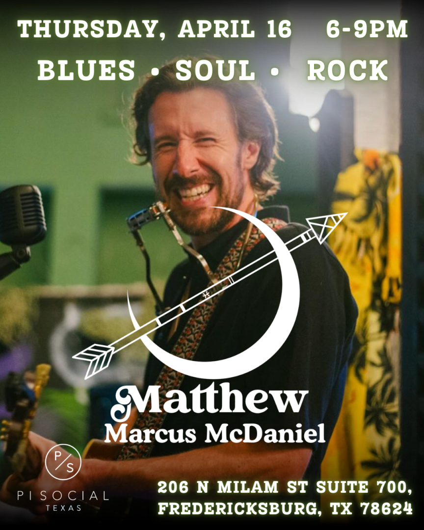 Enjoy an evening with Matthew Marcus McDaniel on the Pi Social Patio from 6 p.m. - 9 p.m! With a blend of blues, soul, and rock-n-roll, his music is the heartbeat of Fredericksburg's coolest party scene. Don't miss out on experiencing one of the city's top hot spot destinations.