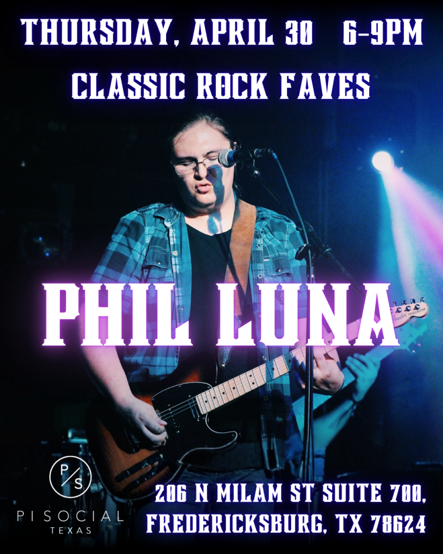 Get ready to rock with Phil Luna on Pi Social's patio from 6 p.m. - 9 p.m.! Experience a night filled with classic rock vibes and contemporary faves that are sure to have you singing along. Join us at one of Fredericksburg's go-to destinations for live music and an unbeatable party atmosphere.