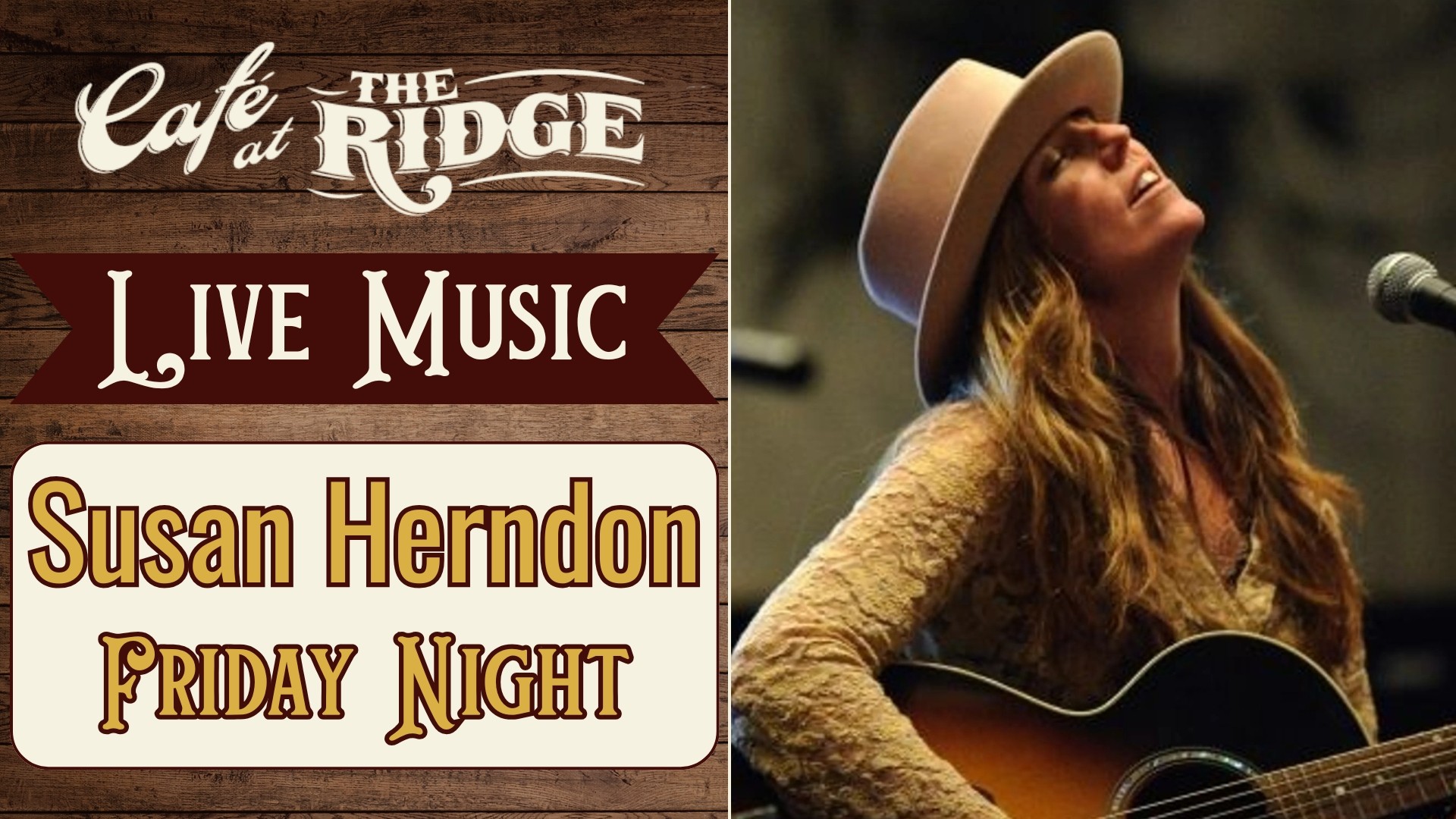 Venez passer une soirée agréable au Café at the Ridge en profitant de la musique live et des délicieux plats préparés par la talentueuse Susan Herndon ! Avec sa voix soul et ses paroles sincères, Susan vous charmera avec un mélange de musique americana, folk et country. C'est le cadre idéal pour passer une soirée agréable entre amis ou en famille. Ne manquez pas cette occasion de découvrir le spectacle captivant de Susan dans notre restaurant accueillant où vous aurez envie de revenir encore et encore.