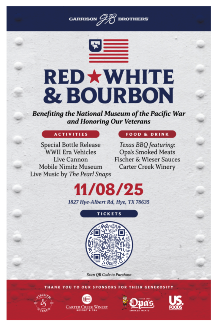 Marquez vos calendriers pour le samedi 8 novembre à 10h00 - notre fête annuelle Red, White & Bourbon Bash est de retour ! Nous nous associons à nouveau au Musée national de la guerre du Pacifique pour une journée inoubliable à Hye, au Texas.