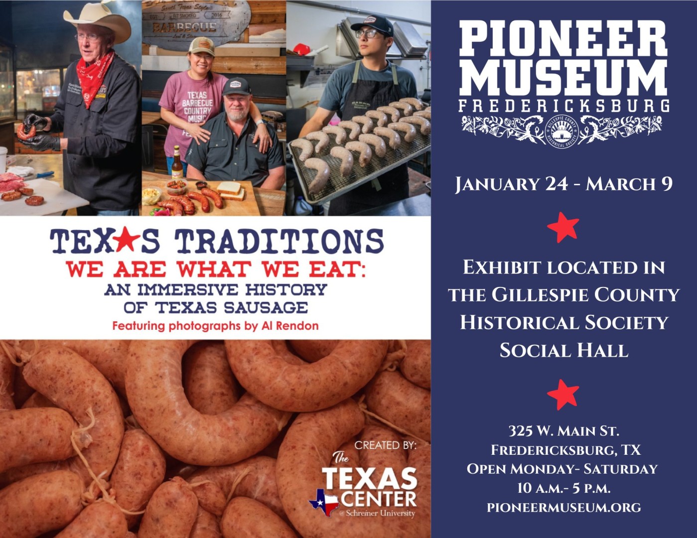 On loan from the Texas Center at Schreiner University, Texas Traditions- We are what we eat: An Immersive History of Texas Sausage, gives a look into the history of sausage making in Texas. The exhibit explores the rich tradition of those that make their own sausage and how some of the most popular barbecue joints are serving up their take.