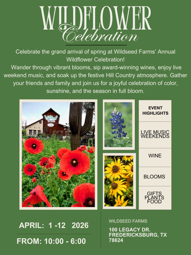 Get ready to welcome spring in full bloom at **Wildseed Farms’ Annual Wildflower Celebration**, happening **April 1–April 12**! This is more than a visit—it’s a festive salute to the season as the fields burst into color and the Hill Country comes alive. Wander through dazzling wildflower trails, raise a glass of our award-winning wines, and soak in the fresh energy of spring all around you.