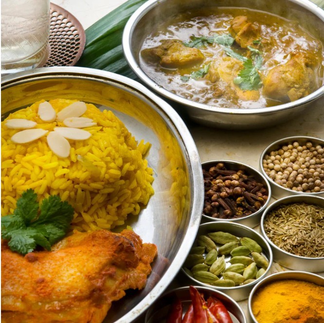 Menu : Salade du jardin d'hiver avec vinaigrette à l'orange sanguine, Soupe de poireaux et pommes de terre, Quiche provençale, Poulet aux épices Tandoori avec pilaf